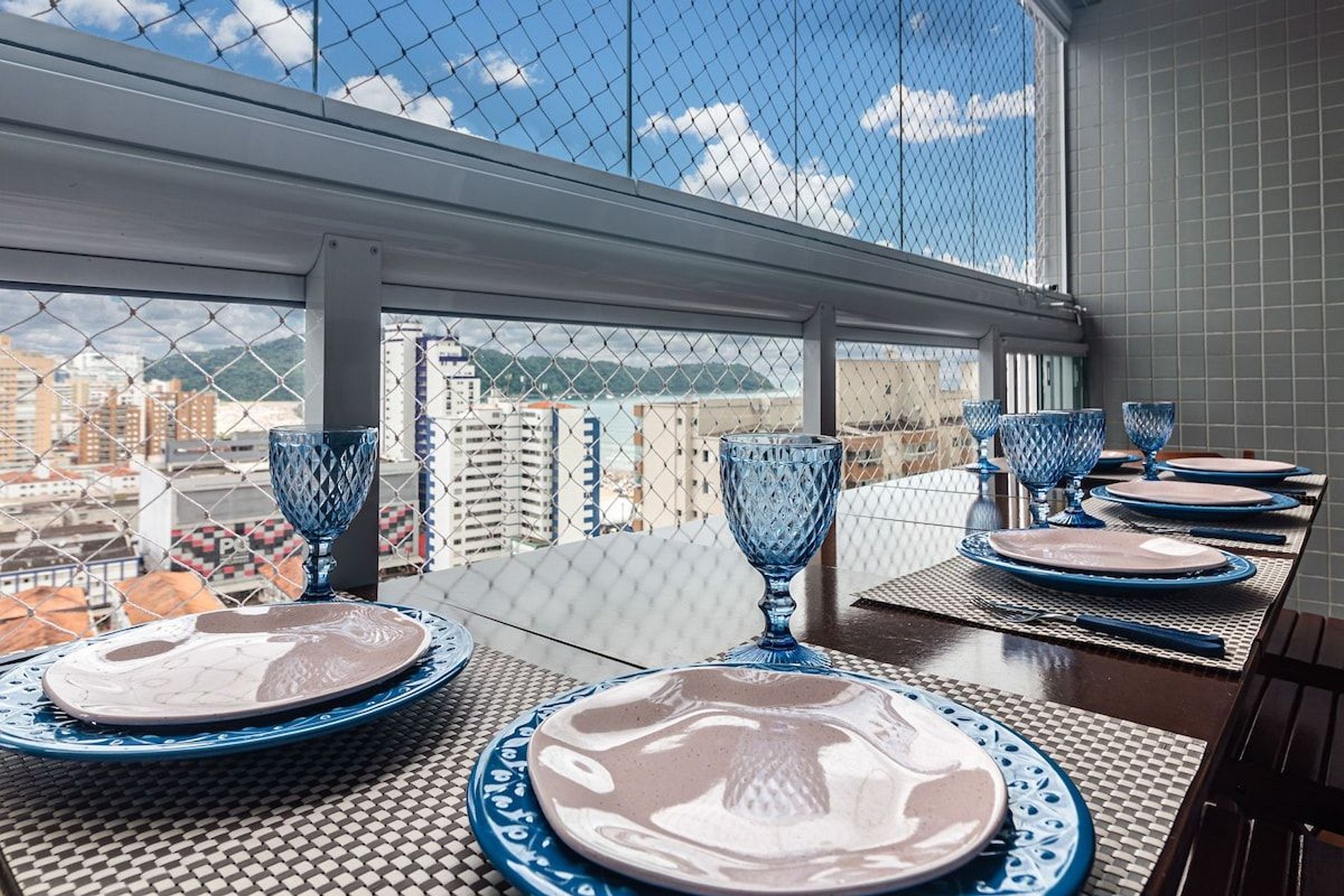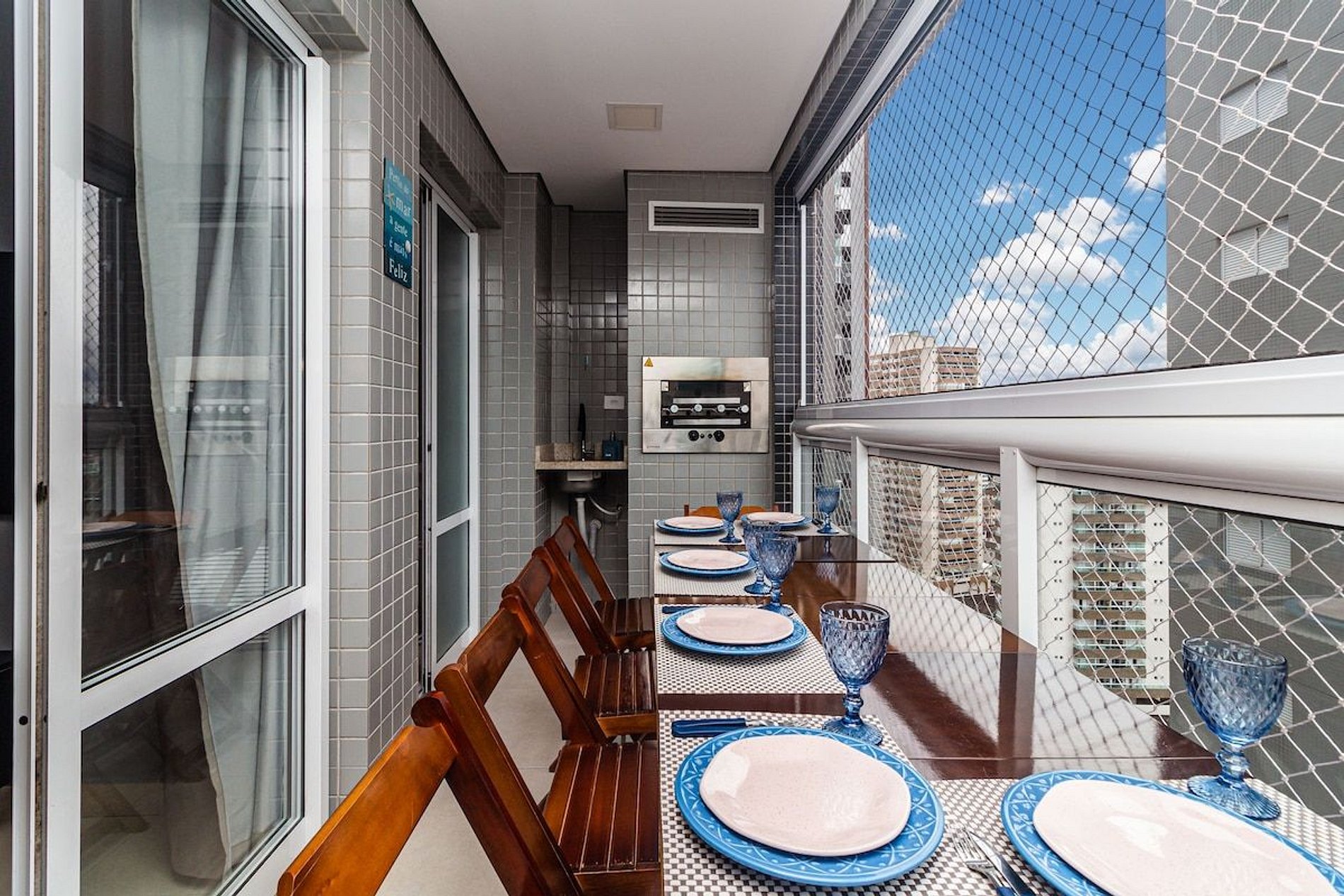 - Sacada gourmet envidraçada com vista para o mar, 3 mesas e 8 cadeiras, churrasqueira a gás com espetos rotativos