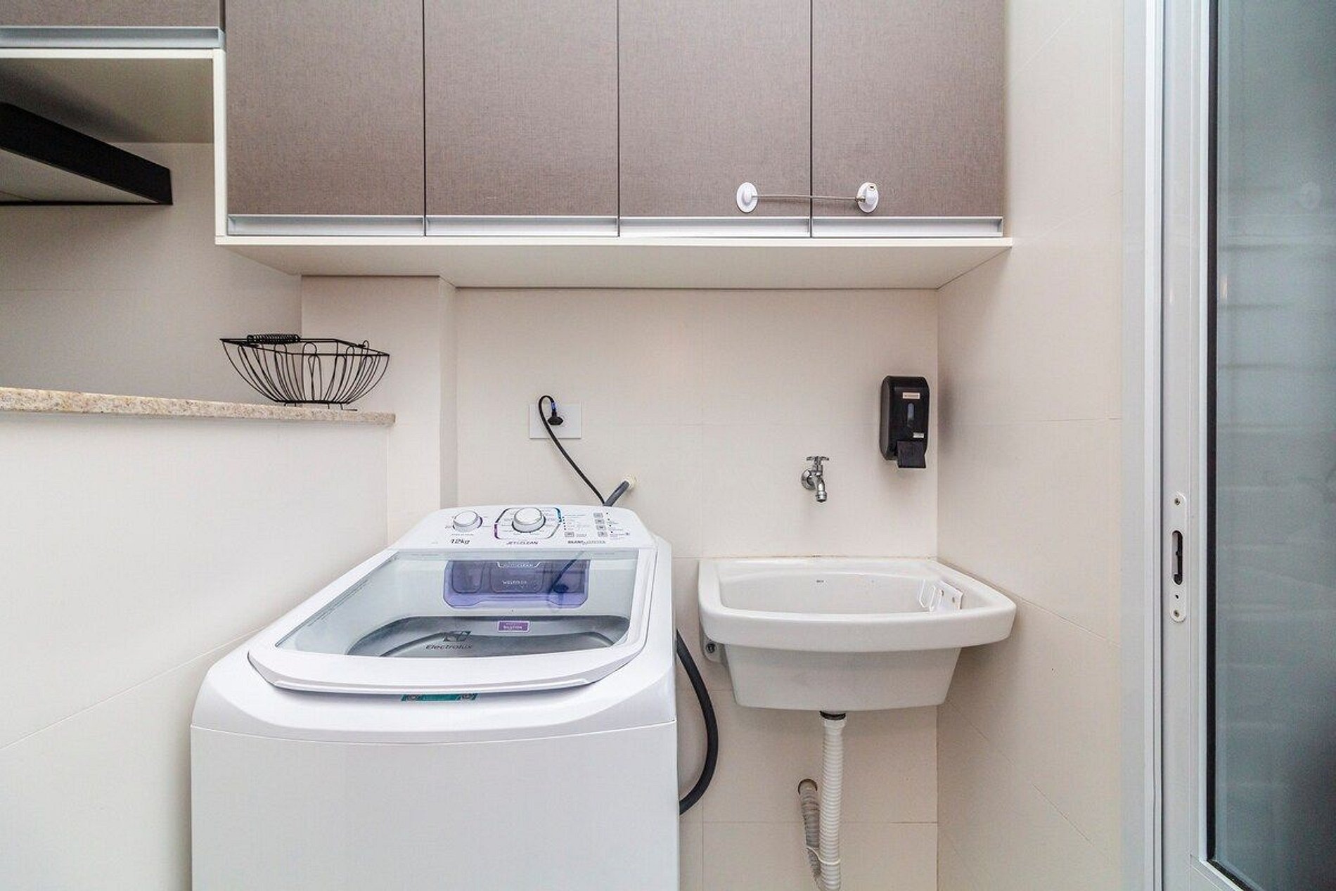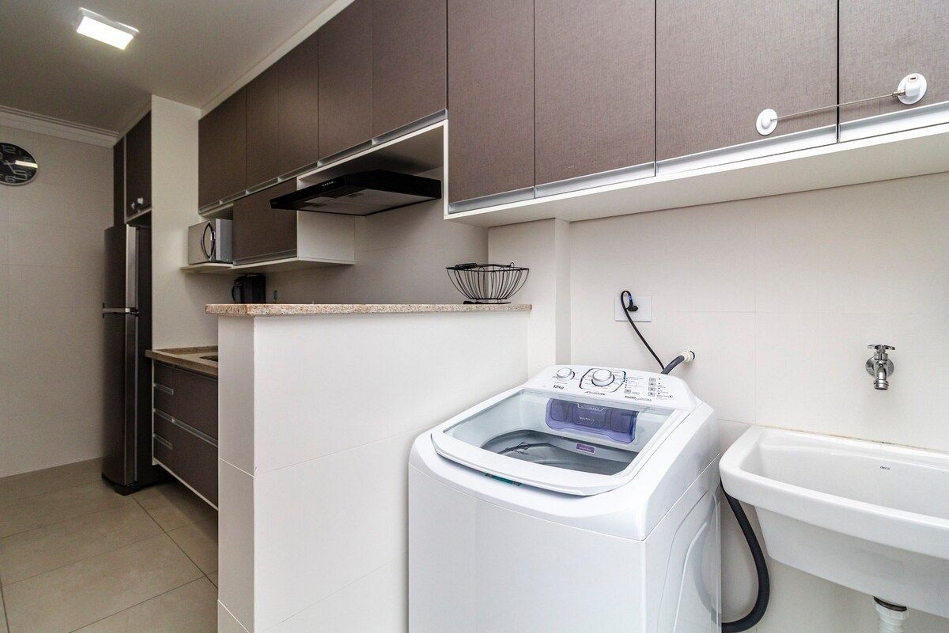 - Lavanderia com máquina de lavar roupas, varal de chão e de teto