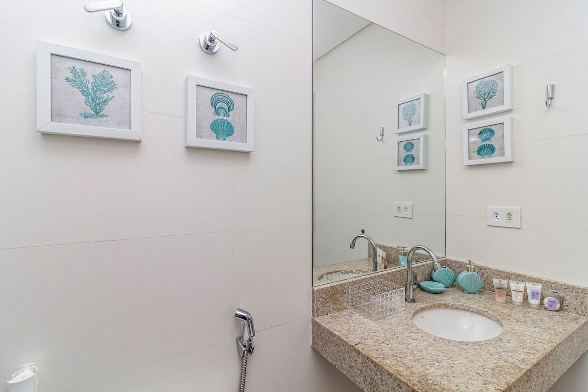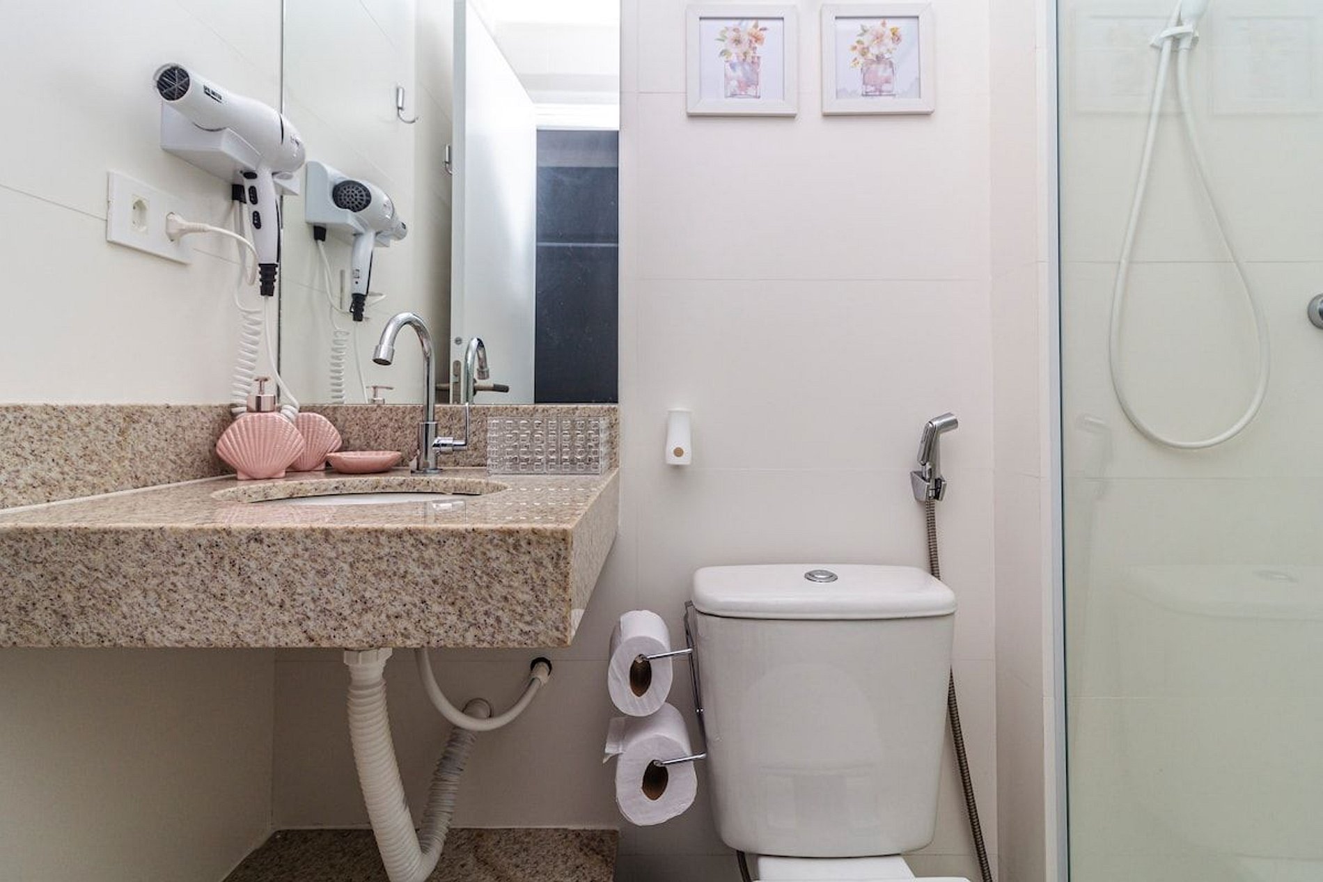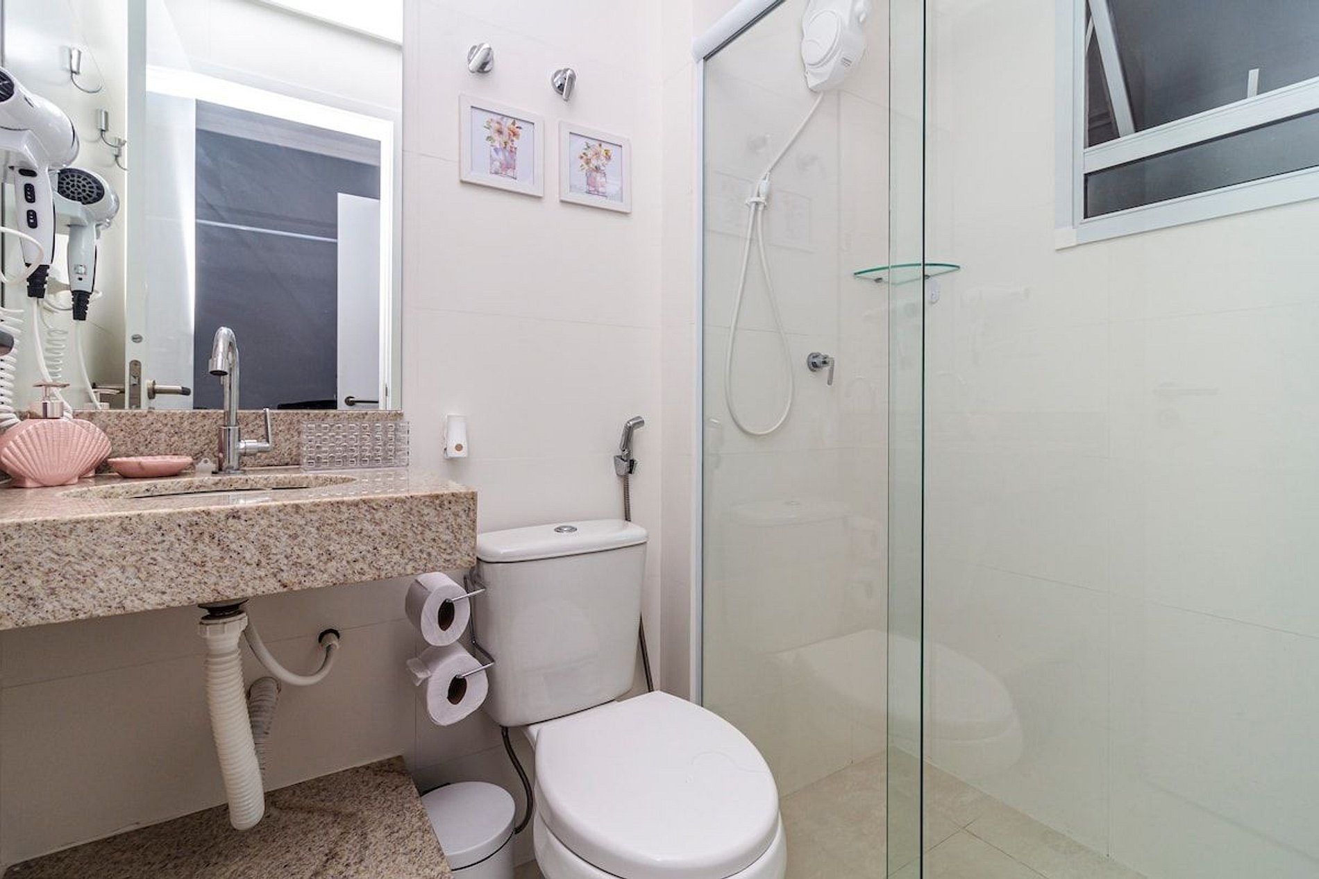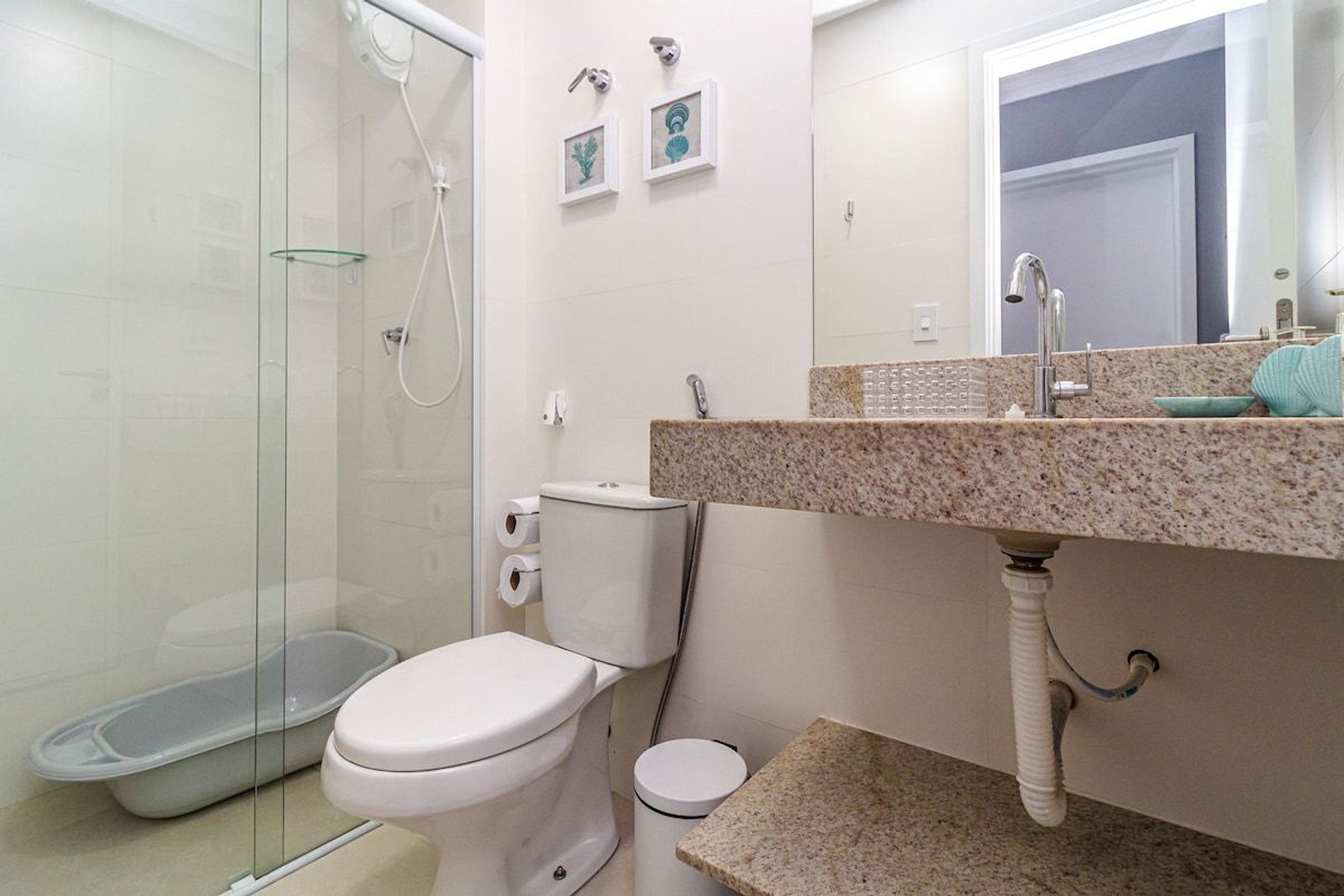 - 2 banheiros (1 suíte) com chuveiro duplo, ducha higiênica, secador de cabelo e banheira de bebê