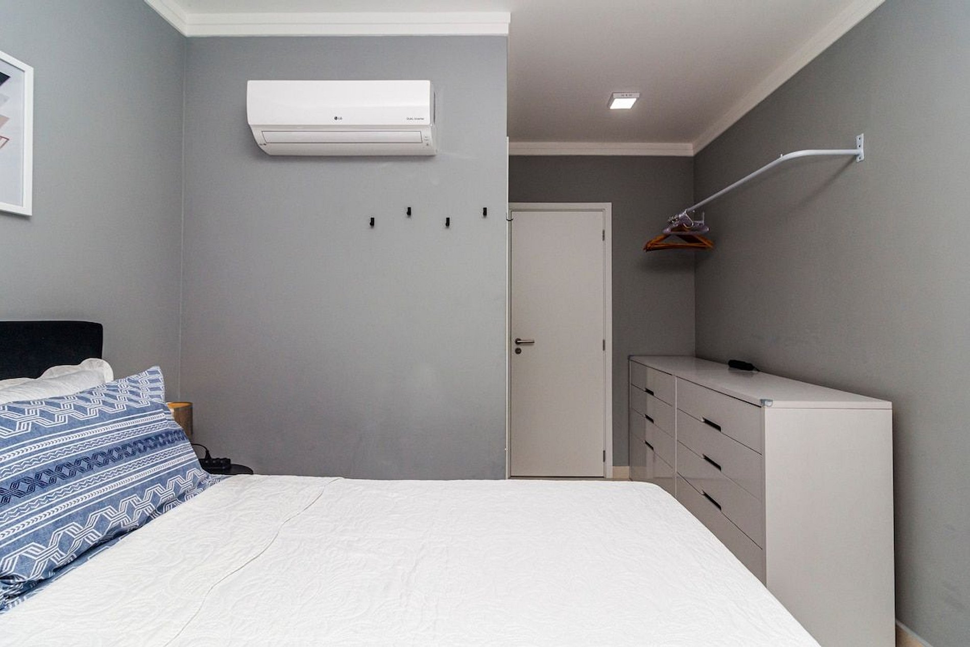 - Quarto com cama box casal e espaço para guardar os pertences